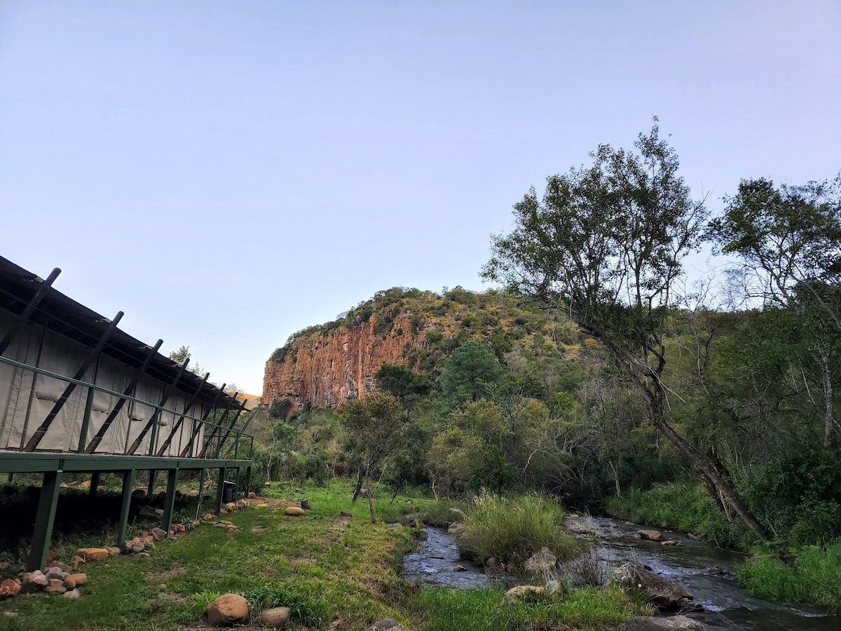 Situat într-o poziție unică de-a lungul pârâului, cu o priveliște uimitoare a stâncilor care inspiră venerație. Cortul luxos în sistem self-catering este conceput pentru a oferi o viață elegantă, cu facilități moderne și confort în interiorul naturii. Corturile de pe terasă pot găzdui fiecare două persoane adulte, cu un lounge spațios, zonă de luat masa și bucătărie, un dormitor și o baie în plan deschis cu cadă, chiuvetă, duș și toaletă închisă. Un pătuț de camping sau un pat de camping poate fi furnizat suplimentar în corturi pentru copii.