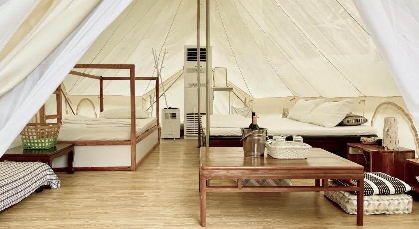 Experience nature uniquely from your private rooftop in our bell tent! Sleeps 3 with a queen bed + optional single bed. Enjoy modern comforts: air conditioning, ensuite bathroom & hot shower. Wake to complimentary breakfast with pool views, plus free Wi-Fi, parking, towels/toiletries & 24/7 support. Ideal for adventurous couples or families seeking a memorable glamping escape