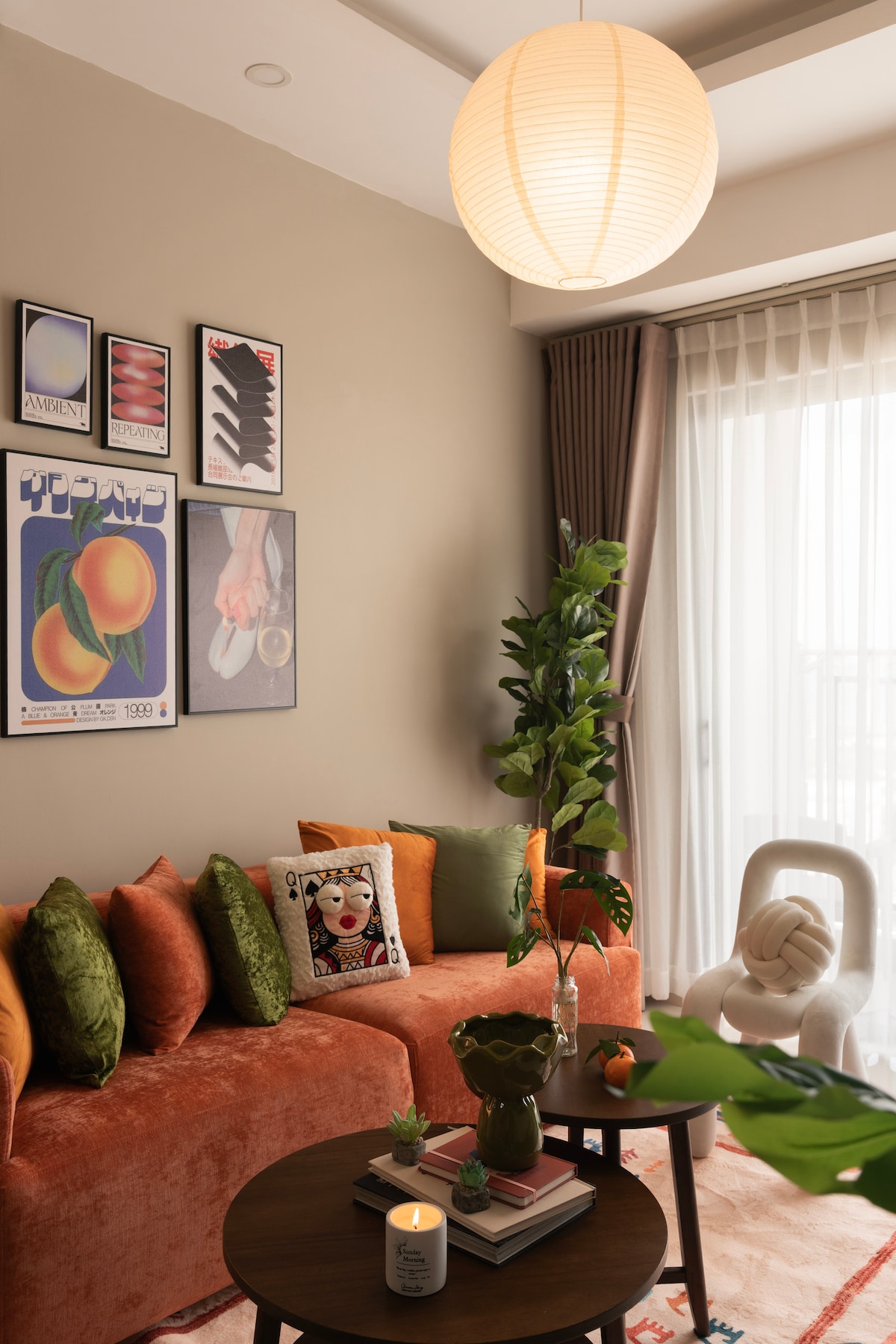 The Colorful Song – Mid-Century Apartment 📏 51m² | 1 bedroom | 🛏 King bed | 🌇 High floor (20th) city view Inspired by mid-century design, The Colorful Song blends warm earthy tones with playful artistic accents. Featuring a statement burnt-orange sofa, soft beige palette, and curated retro artwork, the space feels like a harmonious mix of color and comfort. Natural light from the balcony and gentle warm lighting create a cozy, music-like rhythm throughout the apartment.