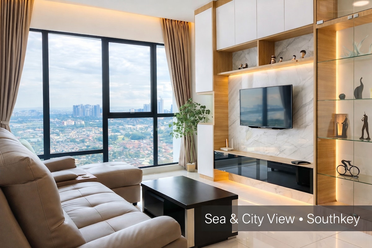 Stai într-un apartament modern cu 2+1 camere, la Southkey Mosaic Residence, lângă Mid Valley Southkey. Perfectă pentru familii sau grupuri mici, această unitate de la etaj oferă priveliști frumoase asupra orașului, Wi-Fi rapid și check-in independent flexibil. Apoi, puncte de reper: • Apartament cu 2+1 dormitoare pentru până la 6 oaspeți • Vedere la oraș și la mare de la un etaj înalt • 10 minute de mers pe jos până la Mid Valley Southkey • 8 minute de mers cu mașina până la centrul comercial KSL City Mall • Smart TV, Wi-Fi rapid și bucătărie complet utilată • Check-in independent flexibil