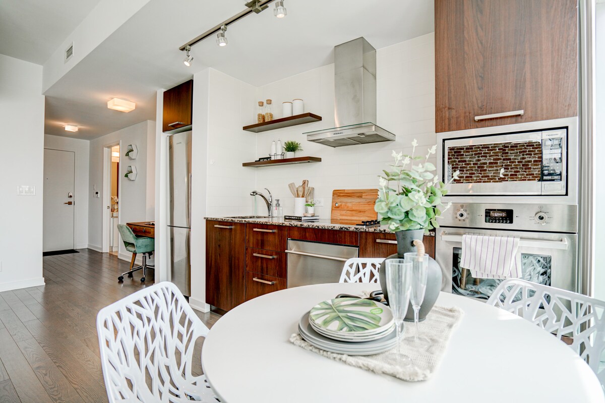 Bucură-te de apartamentul nostru luxos în stil boutique în vibrantul oraș din centrul orașului. Lângă marea sală de concerte Scotiabank Arena, bănci, magazine de băuturi alcoolice și alimentare, baruri și restaurante sportive. Accesează întregul oraș pe căi de acces de la clădire la Union Station. Distanță de mers pe jos până la CN Tower! Finisajele de designer nu seamănă cu nimic din jur. Servicii de concierge gratuite oferite de echipa dedicată de gestionare a proprietății - tururi, viață de noapte, resto resos, servicii private de chef și multe altele!