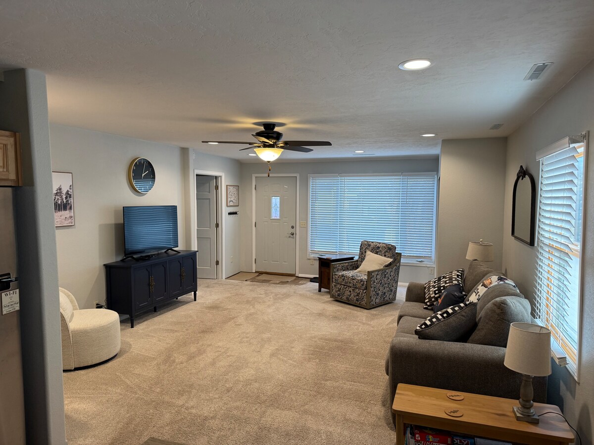 Casă mare complet aprovizionată, care poate găzdui grupuri/familii multiple, 8 paturi, 3 băi, 2 livinguri, bucătărie aprovizionată, terasă, alee, într-un cartier sigur, la 1/2 stradă de parc! Un paradis al jocurilor cu joc de baschet de interior, masă de foosball, hochei pe aer de masă, masă de ping-pong, jocuri de societate și jucării. Credem în micile dotări suplimentare, inclusiv coș cu gustări, cafea/ceai, aparate de aburi pentru duș, bombe de baie, detergent de rufe și halate de baie din camera principală. Vânătorii și pescarii sunt bineveniți! Rezervă-ți astăzi șederea!