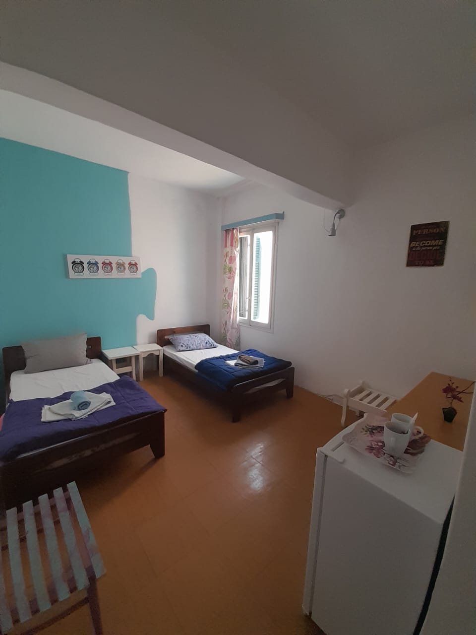 Cameră dublă privată de hotel cu WC privat și duș, Wi-Fi, apă caldă non-stop, prosoape și lenjerie de pat furnizate, la doar 1 minut de mers pe jos de plaja Benitses, vizavi de stația de autobuz (aeroport - Corfu Town - stația principală de autobuze verzi - Insula de Sud) și 1 minut de mers pe jos până la cafenele, supermarketuri, magazine alimentare, închirieri de mașini și biciclete, pub-uri și restaurante.