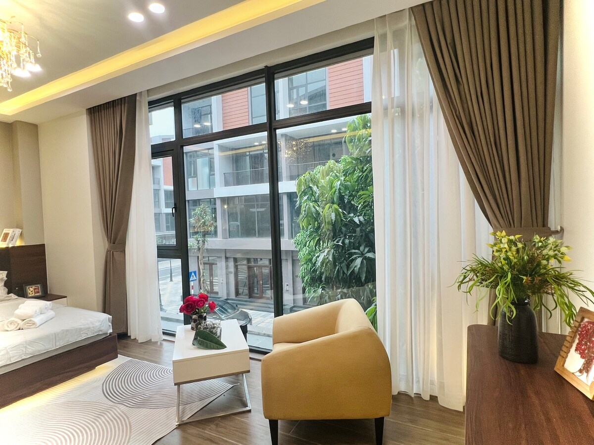 A stylish 1-bedroom duplex in Ecopark featuring a spacious split-level design with high ceilings and large windows for abundant natural light. Enjoy a peaceful green view, modern furnishings, strong WiFi, and a fully equipped kitchen. Ideal for expats, couples, or business travelers seeking comfort, privacy, and a relaxing stay near Hanoi.