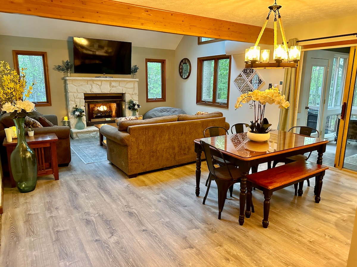 O cabană uimitoare situată ideal în munții Pocono. Destinația ta pentru o escapadă de weekend sau o ședere mai lungă pe tot parcursul anului! Afară te poți bucura de un cadru natural într-o frumoasă proprietate privată împădurită de 1 acru, cadă cu hidromasaj, două gropi de foc, o terasă pentru cafeaua de dimineață sau un grătar delicios. Locuința noastră oferă o atmosferă interioară liniștită, iar locuința este situată convenabil în apropierea tuturor activităților sezoniere din Munții Pocono. Indiferent dacă dorești să te relaxezi sau să te reîncarci, locuința noastră oferă refugiul perfect.