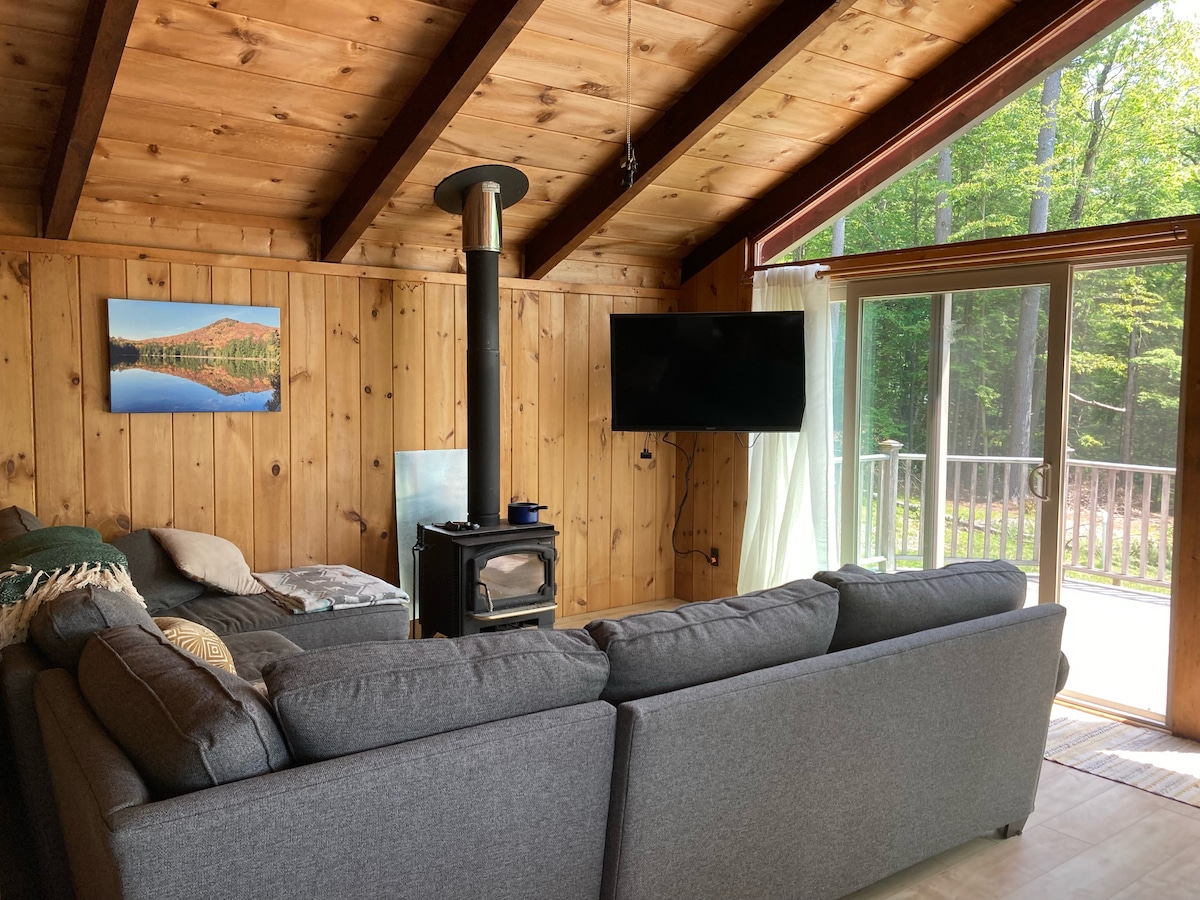 Cozy 2 bedroom A-Frame with lots of charm → Fully equipped + stocked kitchen with sliding door out to deck → Plenty of onsite parking Large yard with patio, gas grill, and outdoor dining. → Wood stove → TVs + fast 300 Mbps Wi-Fi Screened porch and yard are perfect for relaxing and listening to the brook—or a fun space for kids. → 20 min to Plymouth, Lincoln & Waterville Valley (shops & dining) → Easy access to hiking