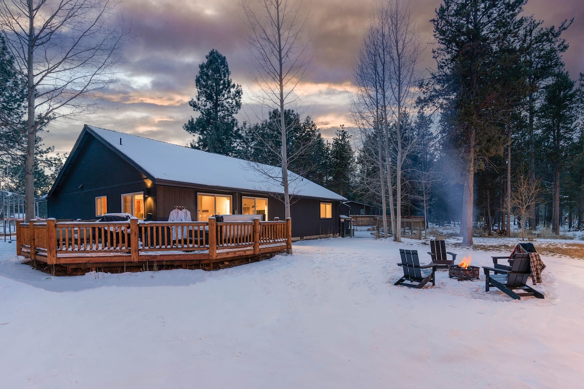 Evadează în escapada noastră potrivită pentru familii, între Sunriver și Mt. Burlac! Aceasta este o bucătărie privată cu 2 dormitoare, canapea extensibilă în cameră bonus pe un acru cu cadă cu hidromasaj! Suntem prietenoși cu animalele de companie, cu o zonă împrejmuită pentru animalul tău de companie. Relaxează-te în cada cu hidromasaj înconjurată de piniosa. Instalează-te confortabil lângă șemineul cu lemne. Avem biciclete, palete de tenis, canoe, etc. pentru a vă bucura de ele! Ia bicicletele și mergi 3 km până la râu, magazin, golf, tenis, Sunriver Village și multe altele. Numai 17 m de Muntele Bachelor!