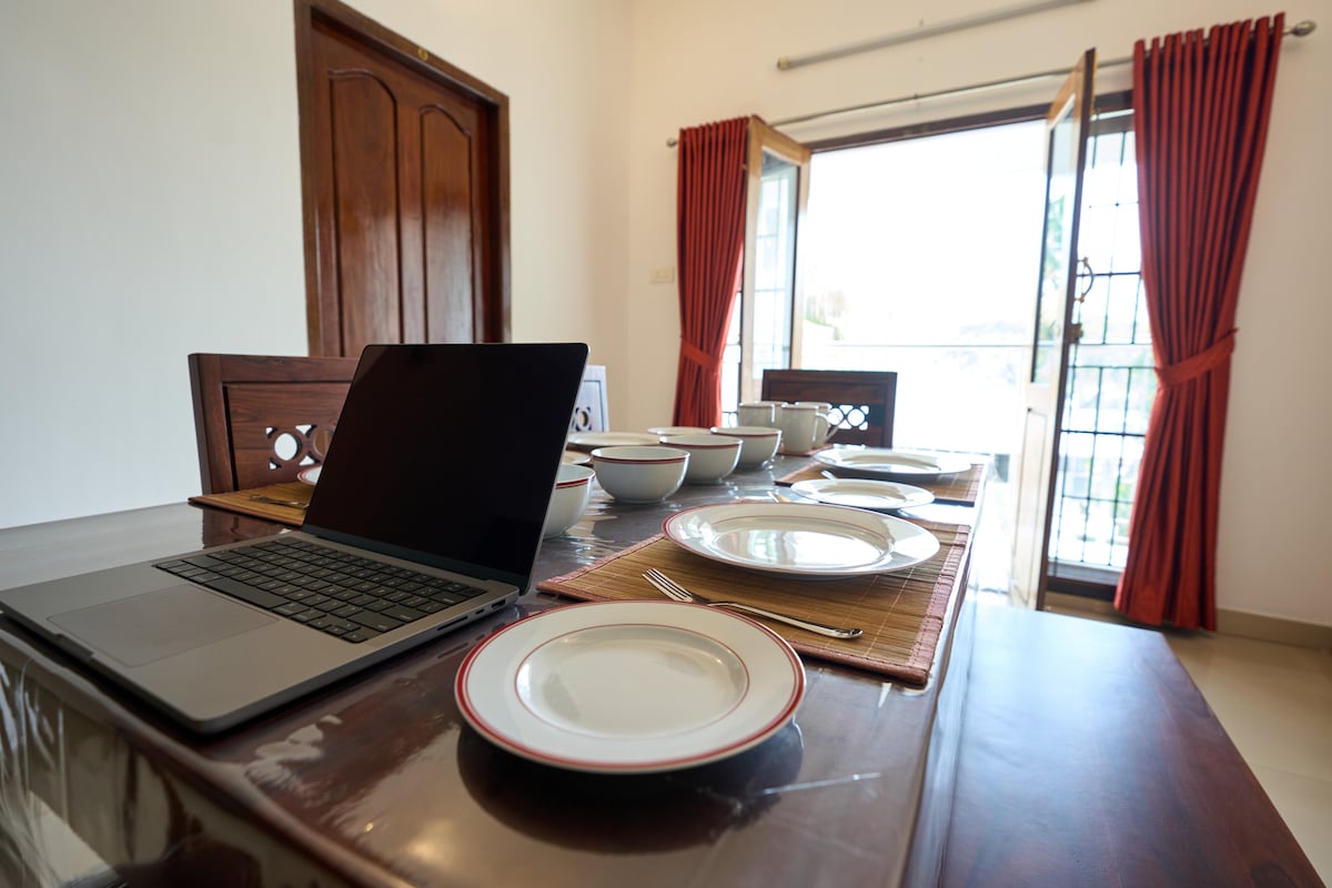 Experimentează o parte din 𝘂𝗽𝗽𝗲𝗿 𝗳𝗹𝗼𝗼𝗿 la Hibiscus Homestay, înconjurat de briza râului și verdeață luxuriantă, la doar 20 de minute de aeroportul Kochi. Acest apartament elegant cu 2 dormitoare combină confortul spațios cu detalii de tip boutique, oferind două băi private - una cu cadă de baie luxoasă și duș cu acoperiș deschis. Cu acces la o cămară și un proiector confortabil, este ideal pentru grupuri de până la 8 persoane care caută calm, confort și timp împreună într-un cadru liniștit pe malul râului.