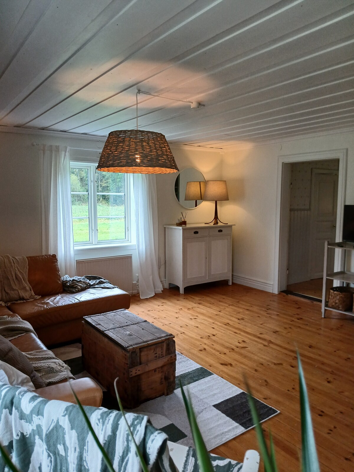Lägenhet i två plan i lantlig miljö. Det är 100 meter till stranden med badplats och roddbåt. Flytväst och metspö finns. Utedasset delas med andra gäster. OBS ! Inget badrum men nära till stranden. Köket är fullt utrustat. Kallt vatten i kranen. Täcke och kuddar finns. Lakan och handduk kan hyras för 75:-/sång. Dubbelsängen är 140 cm bred, de andra sängarna mellan 90-120 cm breda.