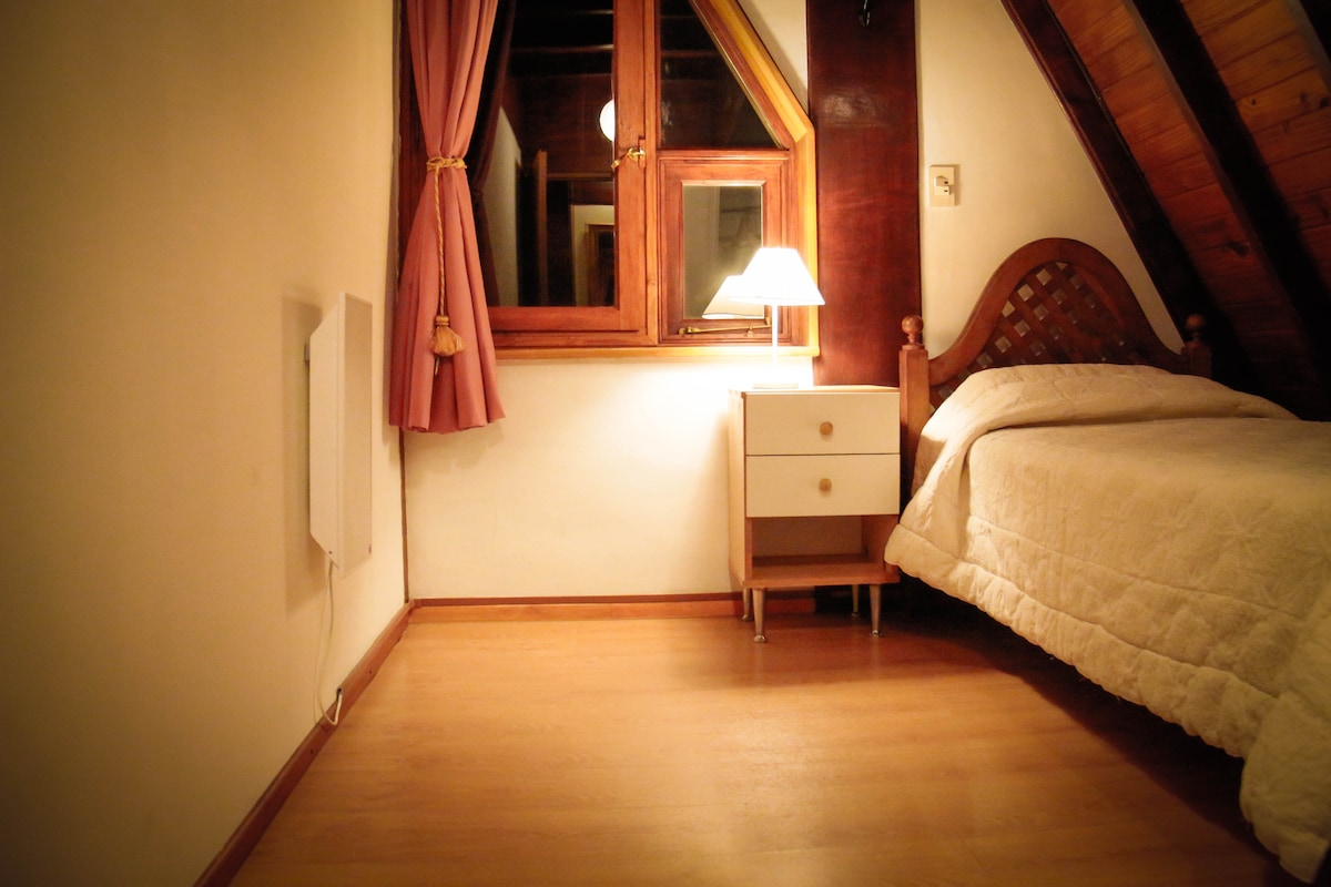 Cabaña de montaña, que consta de 1 ambiente en planta baja con cocina-comedor, equipado con heladera, anafe a gas, horno eléctrico, jarra eléctrica y vajilla para 4 personas. El baño ubicado en planta baja tiene ducha con mampara. En este ambiente hay un futón cama donde pueden dormir dos personas, y en la buhardilla que está alfombrada hay dos camas sommier individuales que pueden unir sus colchones y convertirse en cama matrimonial.