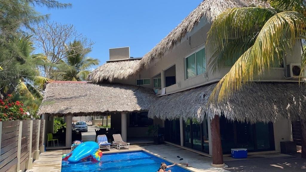 Casă pe plajă cu o ieșire confortabilă și de bun gust la mare, pe palapa principală există un living și o sală de mese pentru 8 persoane cu vedere la piscină, care are o dimensiune foarte bună și are 2 șezlonguri în interiorul apei , lângă acesta un pat matrimonial suspendat pentru relaxare . Are un palapa cu 2 hamace și un loc pentru a face focuri de tabără sub cerul înstelat, ascultând valurile. Bucătărie completă. WIFI contra unei taxe suplimentare. 2 dormitoare cu aer condiționat; parcare pentru trei mașini.
