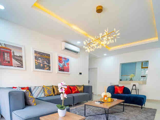 Bine ai venit la Elmstead Luxury Aprt, refugiul tău elegant din Lekki Ikota. Acest refugiu 2BR/2BA oferă confort aer condiționat, un televizor de 65″ în living, TV de 43″ în dormitoare, Wi-Fi gratuit stabil nelimitat și energie electrică non-stop cu invertor și energie solară. Bucură-te de check-in independent cu încuietoare inteligentă, parcare gratuită, o mașină de spălat în unitate și un castel care sare pentru copii. 1 Curățenie gratuită pentru șederi de peste 5-6 nopți. Aproape de Centrul de conservare Lekki, Mega Chicken, Blackbell și Blemco. perfect pentru călători solo, oaspeți de afaceri, familii sau șederi de lungă durată