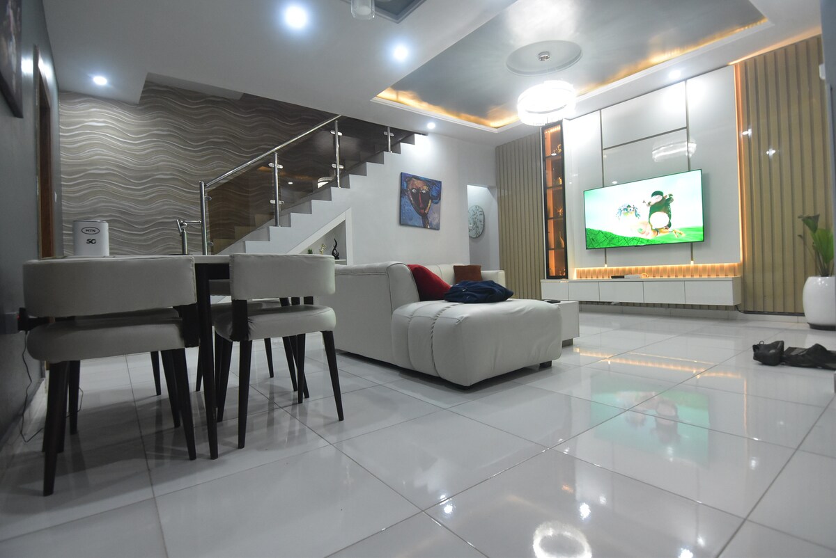 Relaxează-te cu întreaga familie în acest loc liniștit de cazare. Casa este o curte închisă într-un cartier metropolitan securizat. Se află într-o proprietate exterioară cu personal pentru securitate garantată Acest duplex cu terasă cu servicii incluse se află la 3 minute de mers cu mașina de Lagos Business School, la câteva minute de Pepperoni Cinemas & restaurant și la 15 minute de mers cu mașina de plajele Santa Cruz, Laguna și Atican. Sursă de alimentare garantată, fără zgomot de generator sau fum și cartier liniștit, care este o locuință departe de casă.