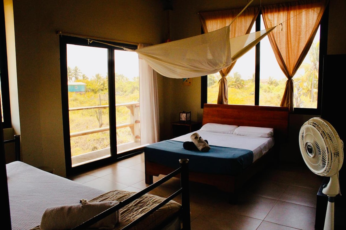 Disfruta de una estancia cómoda y relajante en esta hermosa habitación privada dentro de nuestro hogar. - Habitación: amplia, privada, iluminada, agua caliente, con baño privado, wifi-Starlink, aire acondicionado, balcon. -Áreas comunes: cocina, patio, área de hamacas, terraza. -Ubicación: Jeniffer Hostal, ubicado en Isabela Galápagos, Ecuador. En el centro de la población de Puerto Villamil, a cinco minutos de la playa y cerca de restaurantes, cafeterías, operadoras turísticas, entre otros.