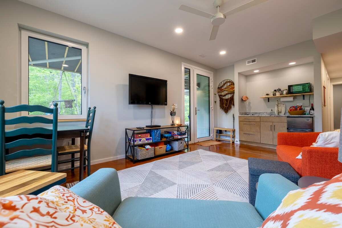 Our house is really special & unique. We want you to come enjoy the space! HUGE Private one room off the back of the house. We share a wall and you will hear us. Room comes with living room area, tv, king size bed, large private master bath, ability to set temperature (within range). Kitchenette amenities available, coffee maker, microwave, fridge, toaster oven and George Foreman. If something you need isn't on the list let us know!
