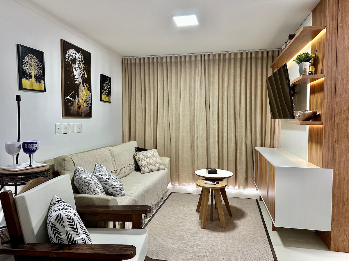 Complete apartment in the city center, close to markets, cinema, restaurants and shops. Less than 5 minutes from the sea! 😃 The apartment has a bedroom, living room, bathroom and kitchen/utility area, fully furnished and ready for use. In the living room, the apartment has a double-size sofa bed. Sea views from both the apartment and the terrace, which has a swimming pool, gym and leisure area. Also includes TV with Netflix and other streaming services (not included), barbecue and garage
