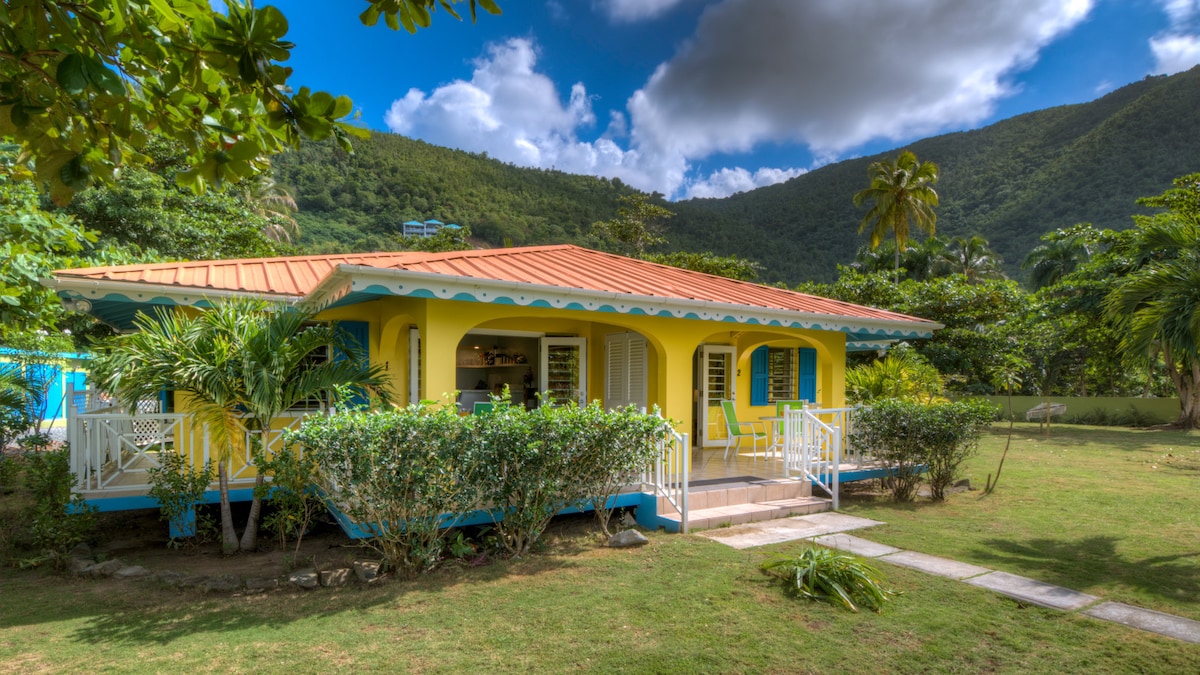 Cabană studio cu chicinetă și terasă în aer liber, perfectă pentru două persoane. La cinci minute de mers cu mașina de Cane Garden Bay și la zece minute de oraș, Botanica este o oază de grădină care se întinde pe un acru, cu patru case independente. În timpul zilei, vei fi uimit de priveliștile dealurilor, golfului și insulelor învecinate în timp ce te bucuri de soare pe terasă cu vedere la grădina luxuriantă. Noaptea, vei fi adormit de sunetele naturii - greieri, broaște și șoaptă a frunzelor de nucă de cocos.