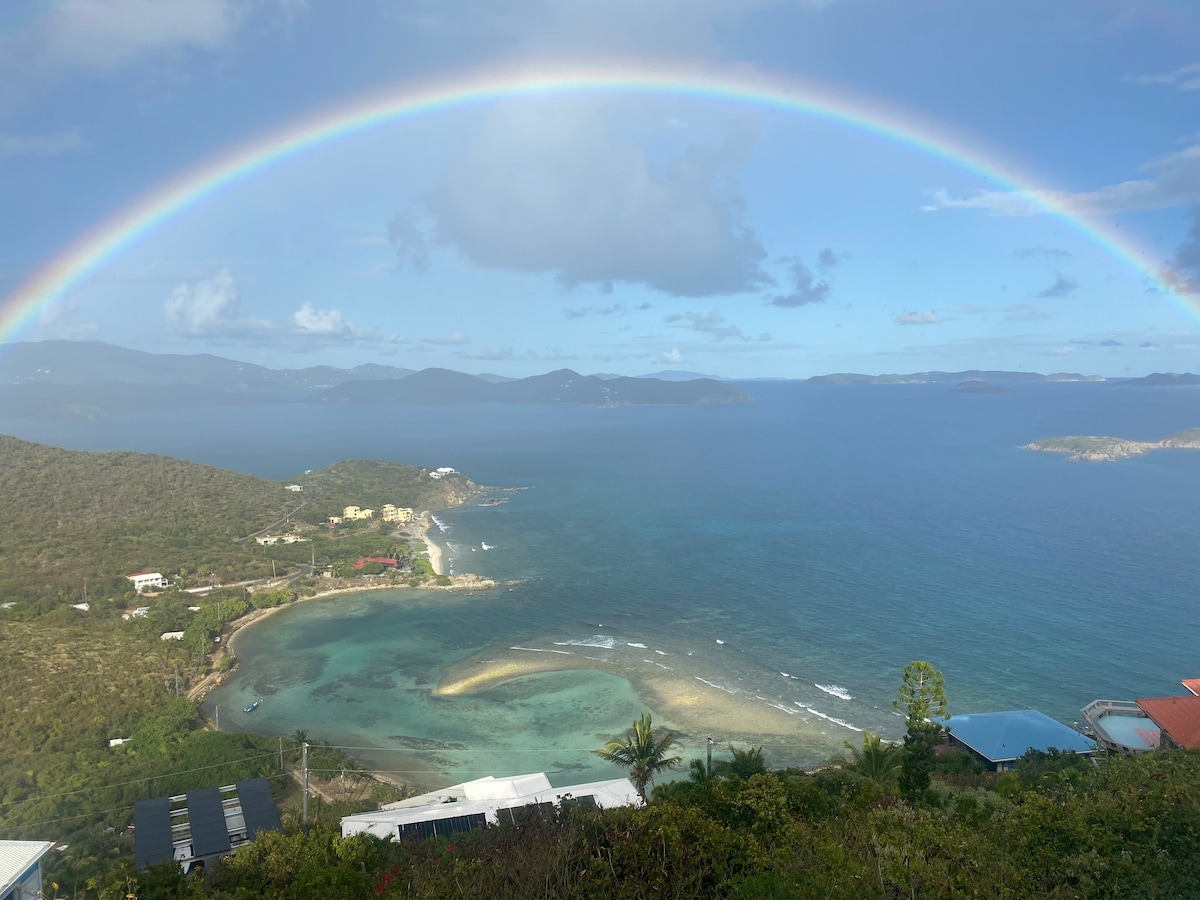 Această casă frumos decorată și remodelată, cu două dormitoare, cu o baie, are vedere la răsărit și o briză puternică a Caraibelor. Poți auzi oceanul și poți privi răsăritul din ambele dormitoare. Există câteva restaurante și o mică piață situată chiar după colț de casă. Magazinele și restaurantele din Coral Bay sunt la doar 3 km distanță. Plan deschis, terasă înfășurată, living spațios, cu un pat matrimonial și un pat matrimonial. Există o mașină de spălat și un uscător automat de rufe nou-nouțe la fața locului.