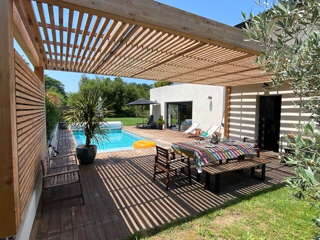Studio modern de 20 m2 cu bucătărie utilată, baie cu duș, pat de 160 cm, TV și WiFi. Acces la piscină încălzită (din mai până pe 15 septembrie) , spațiu exterior comun cu proprietarii; jacuzzi rezervat chiriașilor. Studioul este atașat casei noastre, dar intrarea este independentă. Situat la 10 minute cu mașina de plajele Seignosse, Hossegor și Capbreton, la 25 de minute de Bayonne și la 50 de minute de Spania. Multe piste de biciclete. Parcare închisă în curte.
