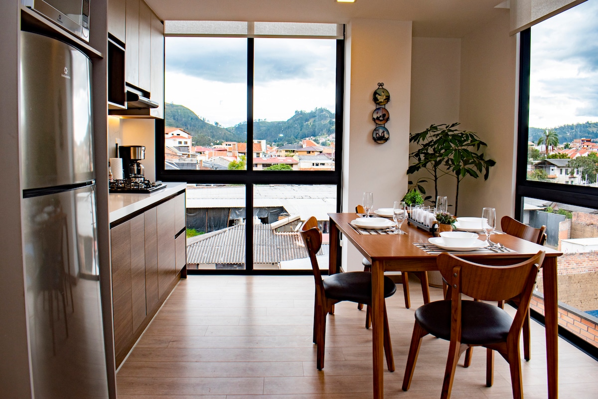 Apartament modern în orașul Cuenca, Ecuador, situat strategic pe Avenida Loja y Cieza de León, la etajul 3 al unei clădiri contemporane. Se remarcă prin iluminatul natural abundent, priveliștea frumoasă asupra râului Yanuncay, o atmosferă liniștită și un design curat și modern. Este ideal pentru o ședere confortabilă, relaxantă și confortabilă. Perfect pentru cei care se bucură de un stil de viață activ, cu vedere la parcuri liniare, piste de biciclete și spații liniștite, conectate lângă râu.