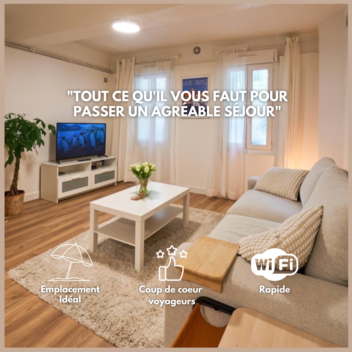 Moderne 3 pièces de 65m2, au calme absolu, vue mer exceptionnelle, wifi ultra rapide, TV UltraHD 110cm Netflix inclus. Vue mer, assis sur canapé, ou allongé sur le lit, idéal famille ou séjour en amoureux. Tout confort, canapé cuir, 3ème étage/4, ascenseur, stationnement gratuit ds la rue. Quartier le + résidentiel à 200m des superbes plages de sable/restaurants, idéal, proche commerces/transports. 5 voyageurs max. Draps/serviettes fournis (réduction possible sans me consulter).