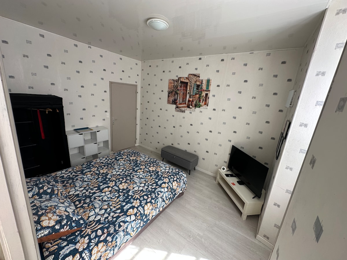 Apartament funcțional și luminos situat în Bastide de Villefranche de Rouergue, în mijlocul orașului vechi. Restaurante, magazine, piață centrală pe o rază de 200 m și la mai puțin de 5 minute de mers pe jos. Parcare gratuită în apropiere. Acces independent și check-in și check-out flexibil. Pat matrimonial în 160 x 200 cu saltea nouă de înaltă calitate și arc de cutie. WiFi disponibil, conexiune prin fibră optică de foarte mare viteză.
