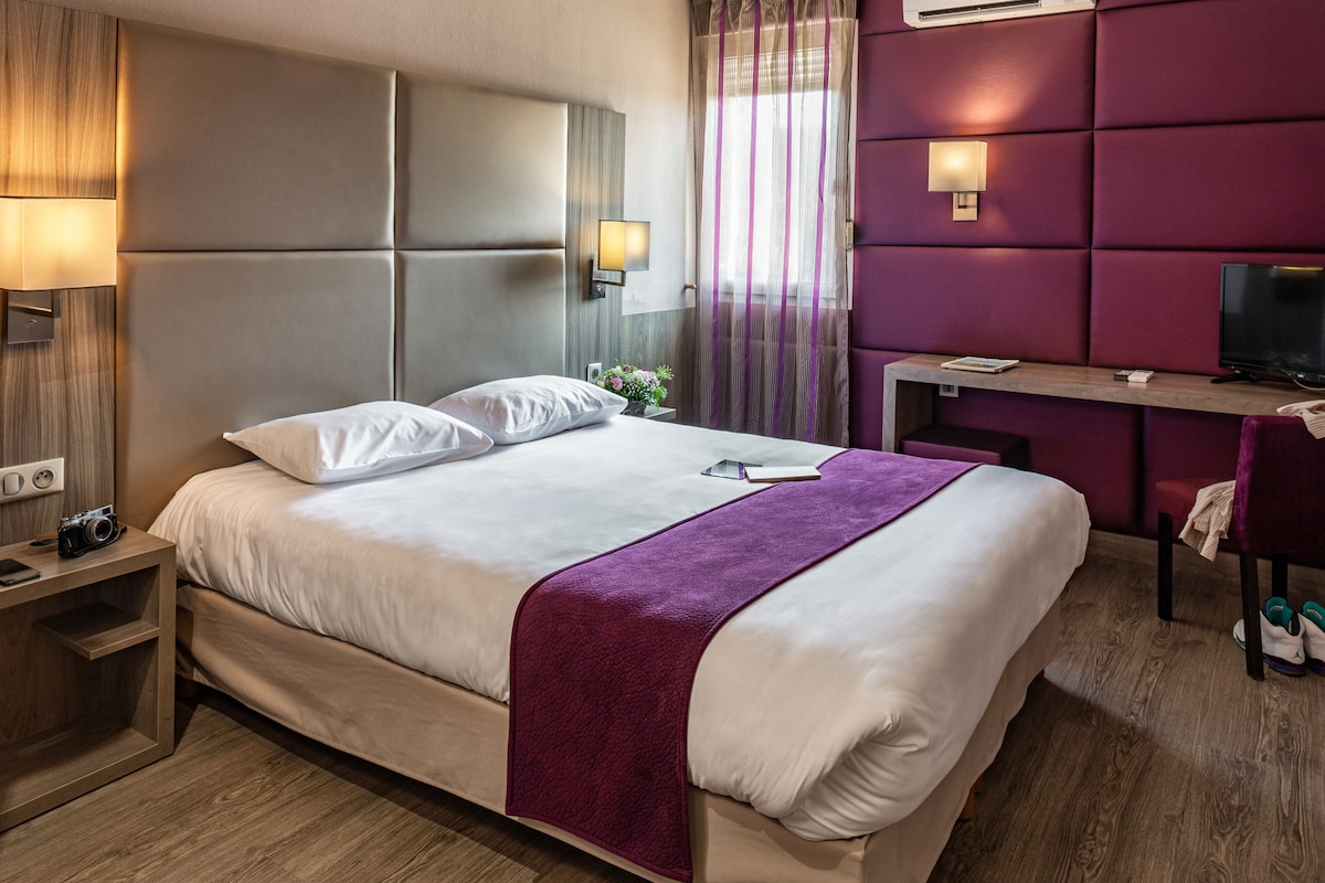 Découvrez notre chambre double standard, idéale pour une ou deux personnes, avec un lit queen-size (160x200). Profitez d’un espace moderne, équipé d’une télévision à écran plat LCD avec Canal+ et Apple TV, de la climatisation réversible, d’un dressing et d’un bureau. La salle de bain comprend une baignoire, un distributeur à savon, des toilettes et un sèche-cheveux, pour un confort optimal durant votre séjour.