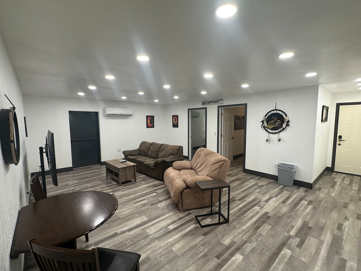 This is a 400 sq ft 1 bedroom suite. It is setup with two queen beds, climate control and 55" smart tv. The kitchen is fully furnished with utensils, dishes and appliances. The bathroom has a glass door shower and endless hot water, from a tankless hot water heater.