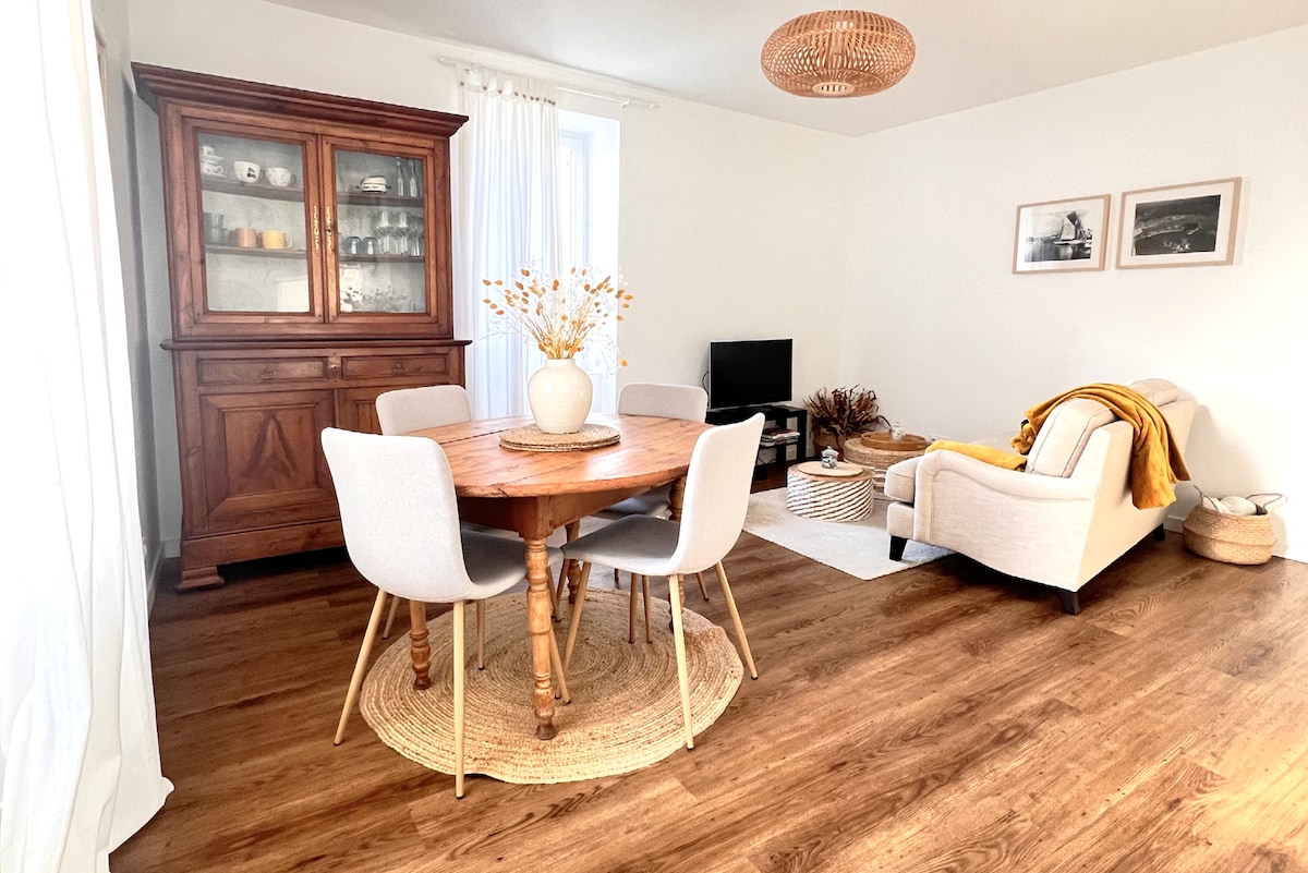Le logement se situe au 2ème et dernier étage d’une petite résidence de quatre appartements SANS ASCENSEUR. Il est composé d’une pièce de vie ouvrant sur un balcon avec vue sur la baie, et d’une grande chambre avec un lit de 140 x 190 cm. Wifi et TV connectée. Capacité d'accueil 2 pers maximum. Au cœur du bourg, vous pouvez tout faire à pieds. Stationnement dans petite cour privée. Arrivée autonome avec boite à clés. Book avec mes adresses et lieux préférés.