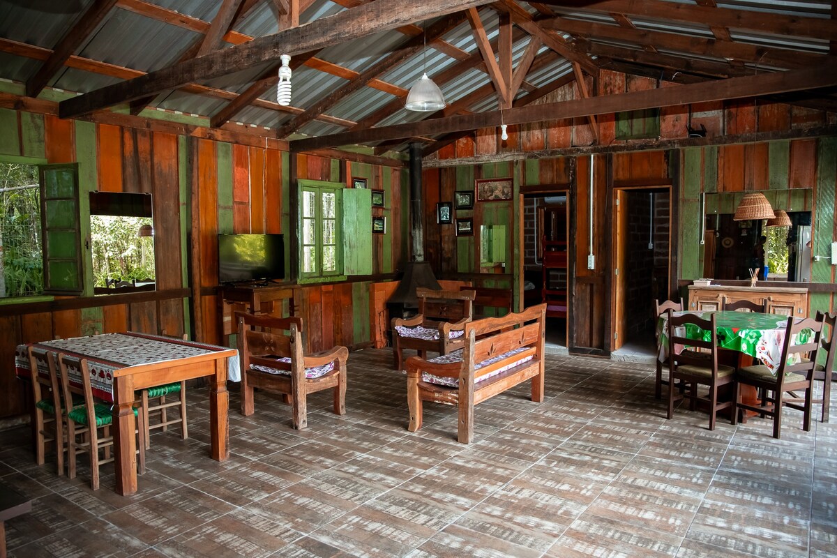 Ne aflăm în orașul Três Coroas, în orașul Serra Grande, care se învecinează cu frumosul oraș Gramado. Am transformat un hambar vechi într-o cabană confortabilă pentru ca tu să petreci zile de neuitat lângă persoanele care îți plac. Să sperăm că vei vedea animale sălbatice, cum ar fi tucani, maimuțe capucin, aracuane, jacus vechi și vei auzi cu siguranță urletul urlătorului.
