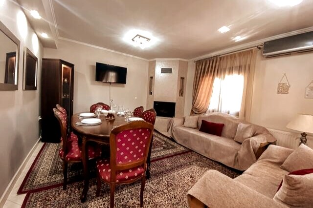 Bine ai venit în casa noastră. Un etaj întreg, la parterul unei case duble, recent renovată, la dispoziția ta și a familiei tale. Familia noastră va fi aproape de tot ce ai nevoie în acest loc situat în centrul orașului Trikala. Încălzirea este cu gaz și aer condiționat cu 3 unități de aer condiționat. Două paturi în dormitoare, precum și două canapele confortabile în living, care se transformă în paturi, pot găzdui 4 adulți și 2 copii