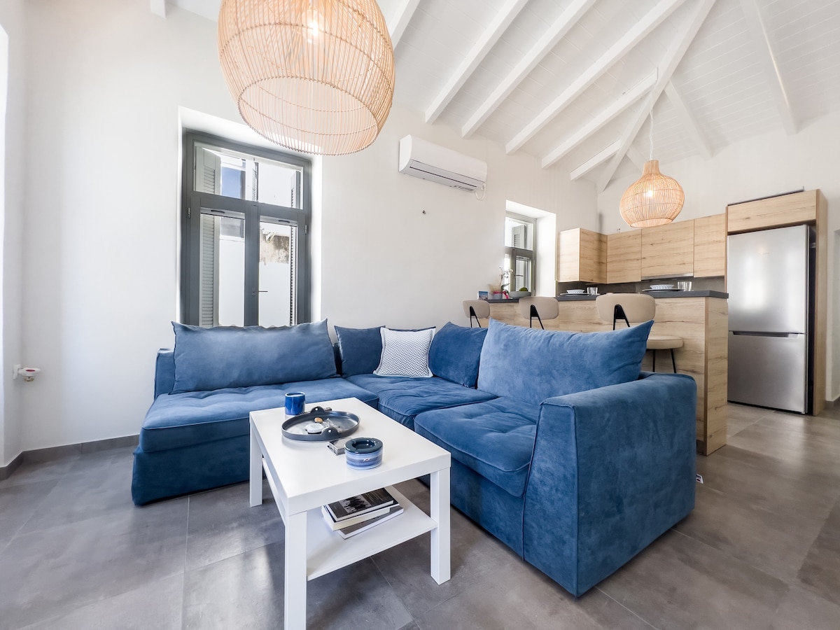Quiet and peaceful.Brand new apartment with panoramic view .The sunrise and the sunset from the large terrace will enchant you,but also the nights with the moon illuminating the sea are beautiful.The view is also visible through the house.Is a hospitable place specially designed with a lot of love for visitors who want to relax and enjoy the beauties of the island.It will my pleasure to host you .Very quiet neighborhood near the center of the island and near the sea.