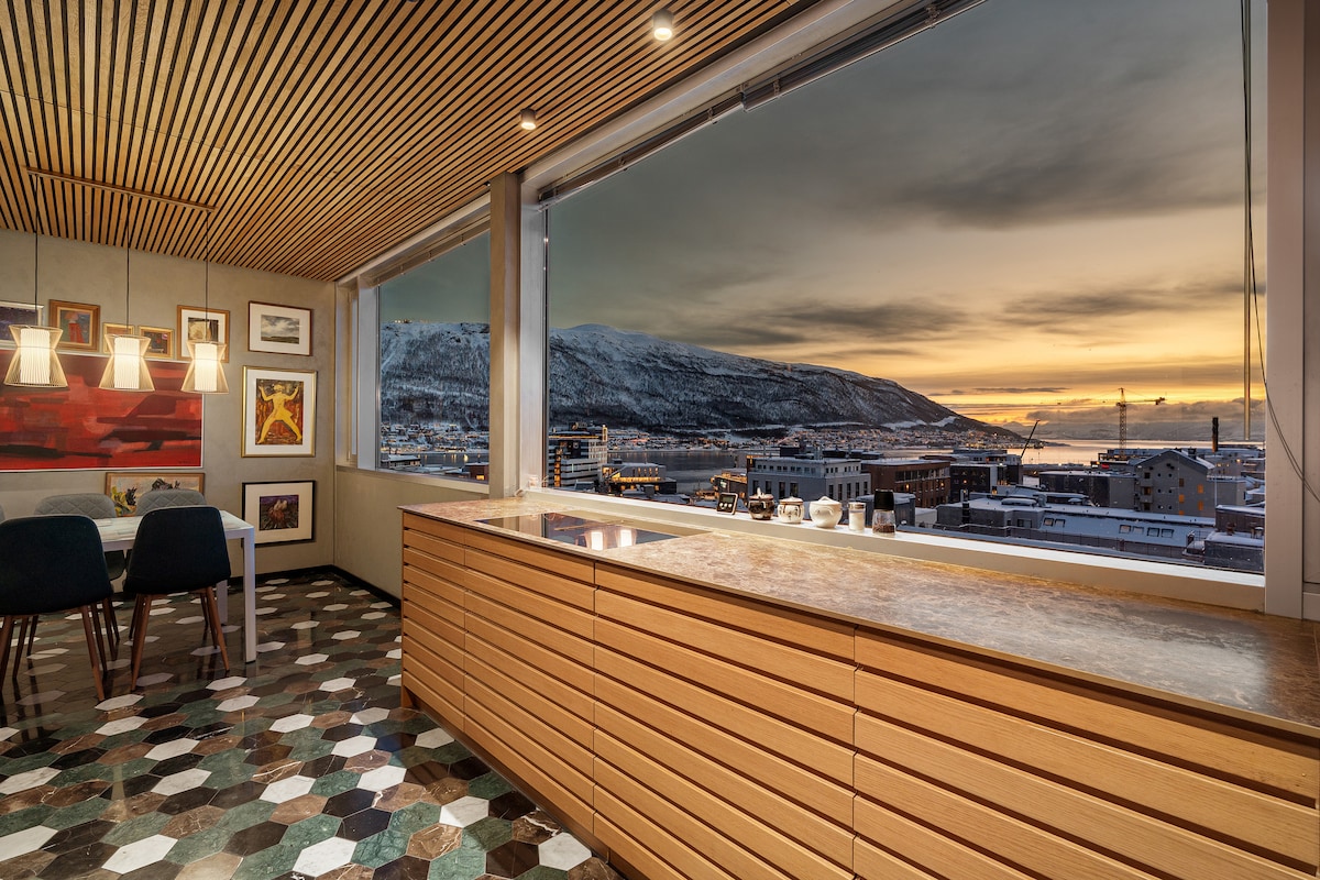 Bine ai venit în acest apartament unic din centrul orașului! Aici obții o combinație rară de lux și cultură locală. Apartamentul este finalizat și elegant, cu accente de înaltă calitate, în timp ce sărbătorește cultura Sami prin haine, un cap de ren maiestuos și un urs polar emblematic agățat pe tavan. Grădina de iarnă îți oferă posibilitatea să te bucuri de luminile nordice sau de soarele de la miezul nopții într-un cadru cald, iar poziția centrală îți oferă tot ce este mai bun în Tromsø chiar în fața ușii.
