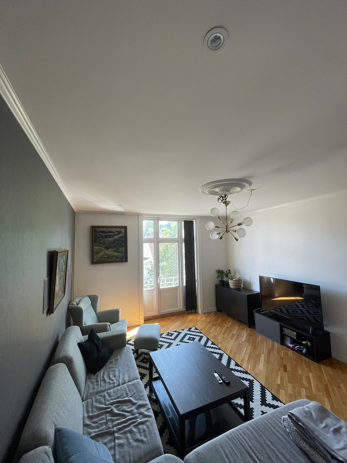 Apartamentul este la etajul al treilea. Perfect situat, la aproximativ 5 minute de mers pe jos de Trondheim Torg, Øya/Nidelven, cât și de mare. În interior este proiectat în mod unic, cu perete curbat și fereastră ovală în living. 66 mp, spațios, cu tavane înalte și dormitoare de 17 mp. Baie de dimensiuni bune. Mobilat cu un amestec de mobilier retro clasic și mobilier modern. Livingul are vedere frumoasă la Steinåsen. Acces excelent la mijloacele de transport în comun, cu o scurtă călătorie cu autobuzul, de exemplu, Bymarka sau Solsiden.
