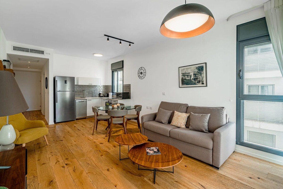Recent renovat 2BR la doar 2 m de mers pe jos de plajă! Situat pe o stradă liniștită, acest apartament elegant și modern are tavane înalte, 2 băi complete, TV de 65", aer condiționat central, perdele electrice opace, dulapuri uriașe și porturi USB. Complet echipat cu electrocasnice germane de top, mașină de spălat/uscător, cuptor pentru mașina de spălat vase, cafea în plus. 5 minute până la Carmel Market și restaurante de top. Proiectat de cel mai bun designer din Tel Aviv. Casa ta perfectă departe de casă. Din cauza construcției în apropiere, prețul a fost redus. יום התארגנות לחתונה