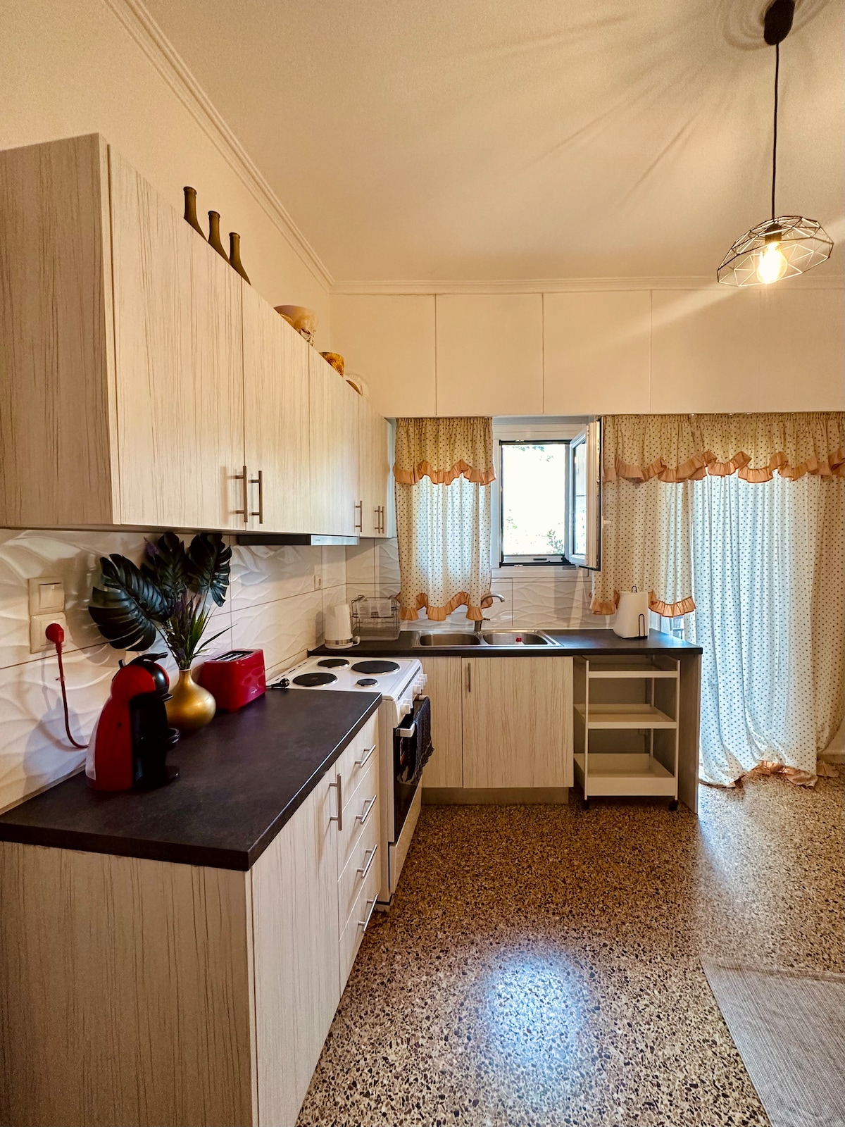 Spațiu liniștit, nou-nouț și elegant, la etajul 1, cu intrare privată și parcare privată gratuită. La doar 7' de centrul orașului Ioannina cu mașina. Alternativ, la 100 de metri există o stație de autobuz. Are bucătărie, frigider, espressor, prăjitor de pâine, fierbător de apă. De asemenea, are Wi-Fi, netflix, aer condiționat, uscător de păr, fier de călcat. La 300 de metri se află o brutărie, o farmacie, un mini-market. Apartamentul poate găzdui confortabil doi adulți sau un cuplu cu un copil mic.!