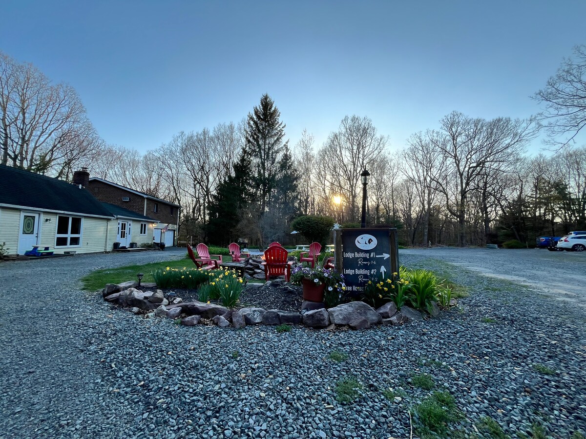 Bine ați venit, suntem The Sleeping Bear Retreat; O proprietate împădurită în vârf de munte, care se întinde pe 7 acri frumoși, situată la 6 minute în afara centrului orașului Jim Thorpe. Pe proprietatea noastră avem un număr de camere de cabane unice și cu tematică individuală, într-un cadru forestier rustic. Moose este o cameră confortabilă și privată 1BR/1Bath Lodge, cu o intrare privată detașată de casa principală. În plus, această cameră de lojă specifică oferă un spațiu de lucru pentru lucrătorii la distanță care caută o schimbare în peisaj!
