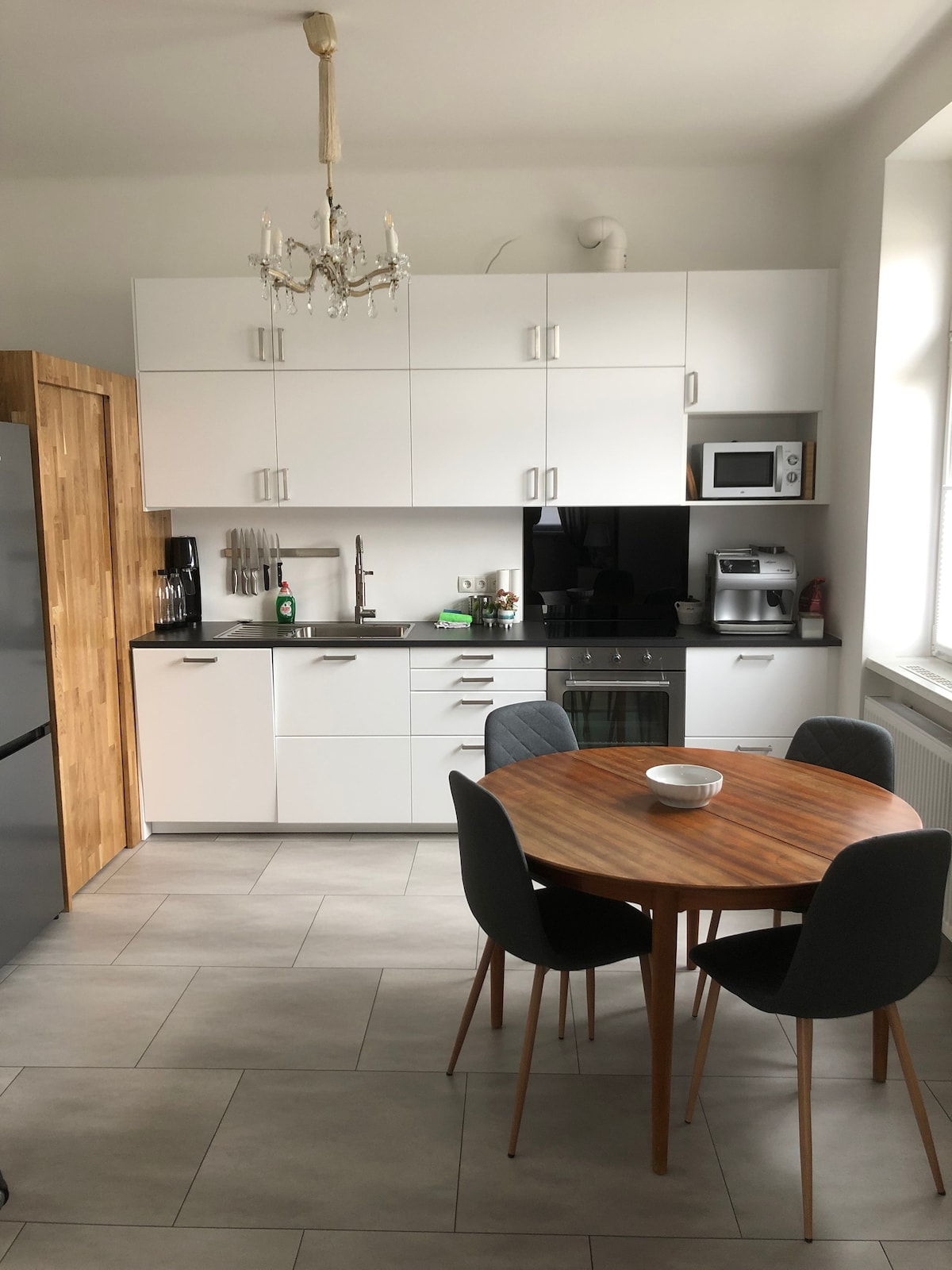 Apartament cu 3 camere una în spatele celeilalte într-o parte separată a unei vile la periferia de vest a Vienei. Conexiuni bune de transport public (tren și autobuz) către centru, 1 loc de parcare privat în fața casei. Grădină de iarnă confortabilă, cameră fermecătoare Biedermeier cu pat matrimonial, pat de o persoană și grup de scaune. Dormitor (două uși) cu pat dublu și pat supraetajat. Bucătărie convenabilă cu canapea, loc de luat masa, mașină de spălat vase, cuptor cu microunde cu microunde. Baia include toaletă și duș.