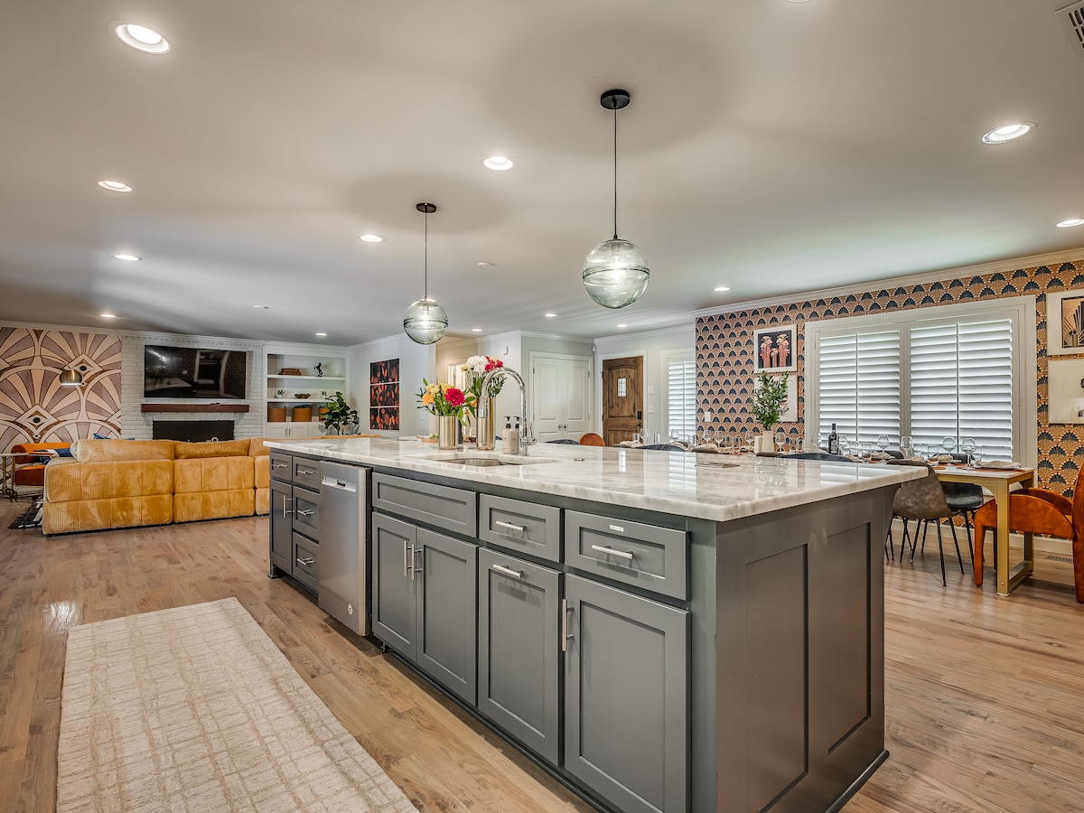 ✤ Luxe 2,500ft² home in upscale neighborhood ✤ 3 min to Utica Square and Cherry Street, 5 min to Expo Square, 10 min to DT Tulsa, close to cafes, shops & restaurants ✰ Fully equipped quartz waterfall kitchen w/ SS KitchenAid appliances ✰ Dog friendly fenced backyard w/ stone outdoor kitchen & BBQ ✰ Elegant Marble bathrooms ✰ Fun Kids' playroom & attached office ✰ 2 x 75"/ 3 x 55" Smart TVs ✰Memory Foam ✰ Pets: dogs only (max 3), under 80 lbs / $125 fee