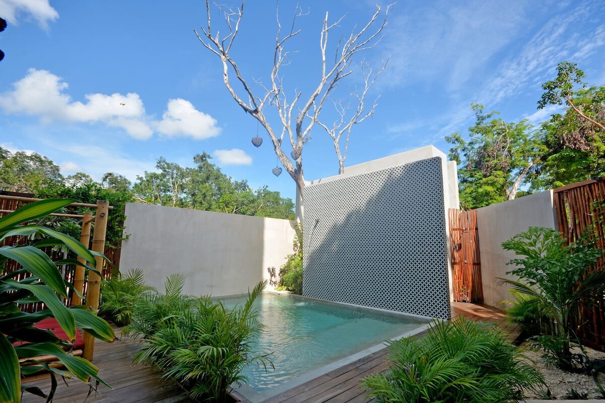 Casa ta de vacanță departe de casă; ideală pentru cupluri, nomazi digitali sau călători singuri. Cu internet rapid, dormitor cu pat king-size, unitate de aer condiționat, chicinetă și piscină cu balcon. Vei avea acces la zone comune incredibile, cum ar fi piscina de pe acoperiș, jacuzzi și multe altele. Una dintre cele mai convenabile locații, vei fi la câțiva pași de unele dintre cele mai bune restaurante, magazine și supermarket; și aproape de plajă. Vei avea tot ce ai nevoie pentru a trăi experiența Tulum.