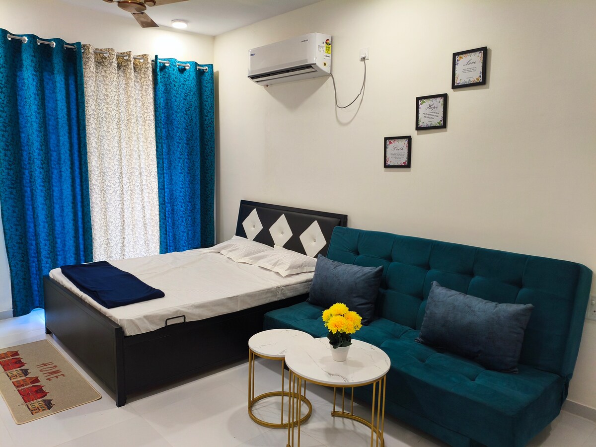 Boho Style Luxury Studio with Jacuzzi and Garden. A peaceful getaway. Fully loaded with WiFi, JBL 2.1 Home Theatre, BT Music System, Full-HD LED TV. A stylish bathroom with toiletries. Pantry with tea/coffee supplies, RO water, Microwave, Induction Hob, Fridge & s/w Toaster. Fenced garden for children. Dine in the garden with beautiful weather. Jacuzzi has hot water that can be used anytime. Common amenities on-site like swimming pool, games room, gym, mini theatre, cycling and restaurant.