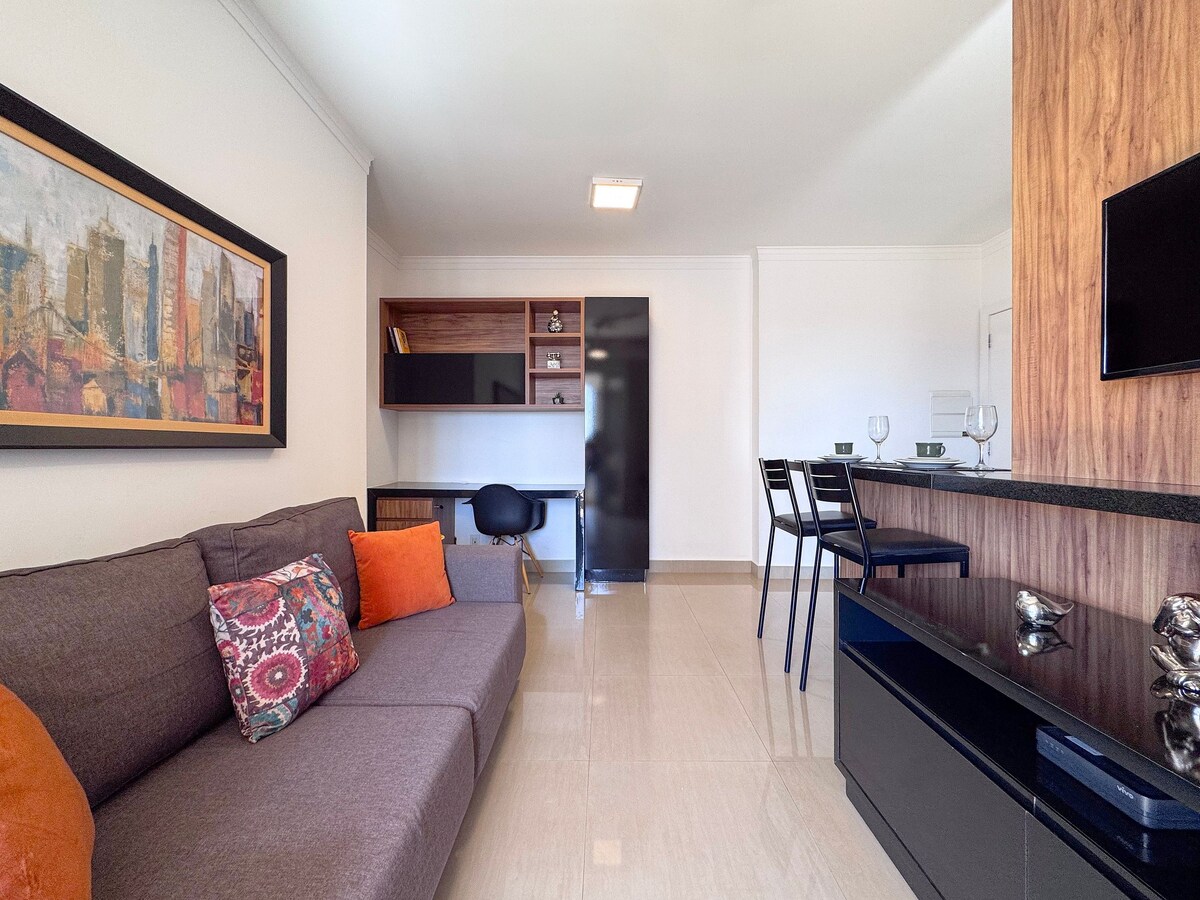 Loft com mobília nova e bem decorado. 34m2 planejados para acomodar confortavelmente 2 pessoas. Integra quarto, sala, cozinha e um diferencial: Escritório na sacada para quem precisa trabalhar em casa. Sacada fechada de vidro com cortinas blackout garantindo sua privacidade. Cama queen size com roupa de cama e banho completo. Sofá vira cama caso necessário. A Smart TV Led é de 55'', na foto está com uma de 70''.