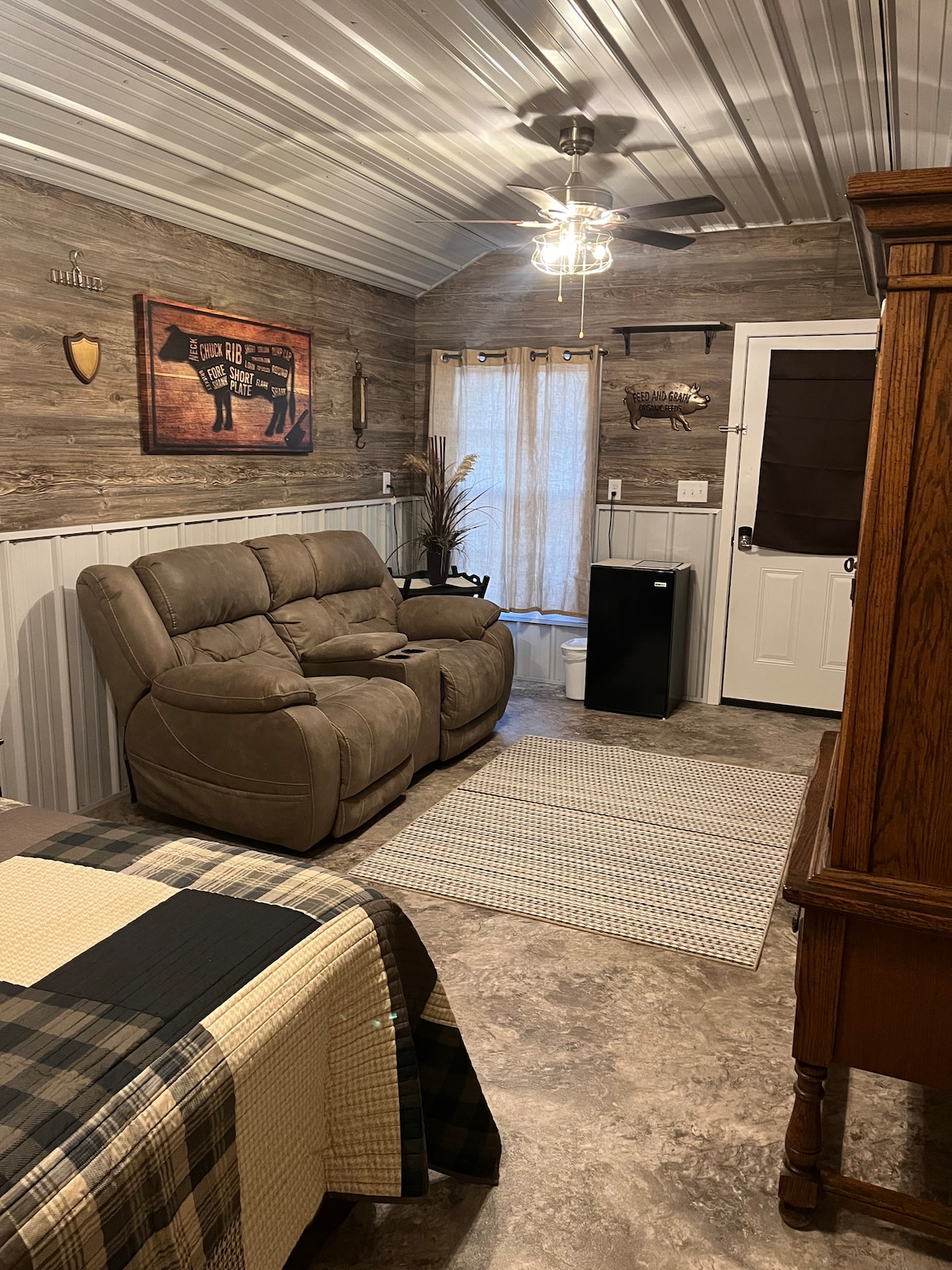Welcome to our charming boho-inspired Grain Bin Cabin, the Highland is ideal for 2-3 adults or 2 adults and 2 smaller children. Upstairs, you'll find a comfortable king bed in the loft, while downstairs features a cozy futon in the main living space. The full kitchen is equipped with everything you need. Full Bath with a walk-in shower downstairs. Experience a serene countryside getaway with breathtaking sunsets and peaceful surroundings, just moments away from Versailles.
