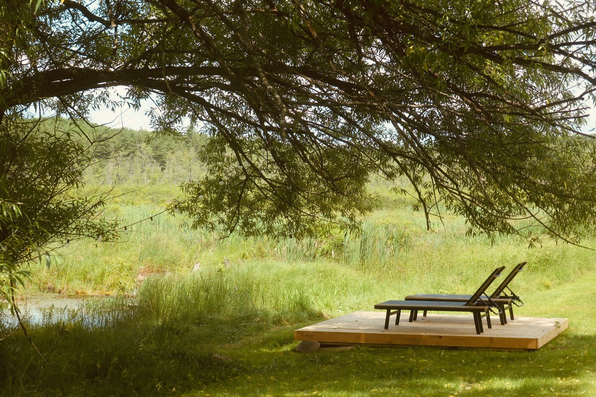 Descoperă un paradis retras pe peste 11 acri, cu un pârâu, un iaz și o pădure. Acest Airbnb privat are un dormitor cu un pat matrimonial, o baie mare, o zonă de living în plan deschis și o terasă cu priveliști uimitoare. Proprietatea include o sală de jocuri/studio cu podele încălzite pentru yoga sau fitness, plus o jumătate de baie. Perfect pentru iubitorii de natură care caută liniște și confort. IMPT: Nu percepem o taxă de curățenie - în schimb, te rugăm să lași totul curat și ordonat atunci când faci check-out.