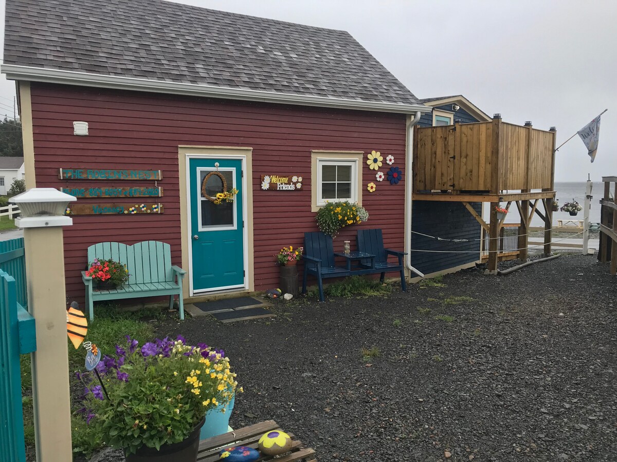 Amplasat în centrul frumosului Twillingate Newfoundland, ne veți găsi, Cuibul lui Robin, cabana noastră roșie. Dacă sunteți în căutarea unei escapade private liniștite, care este aproape de restaurante, pub-uri, berărie, divertisment, cumpărături și un loc de joacă frumos la care puteți merge în timp ce aveți propria plajă privată, ați găsit ceea ce căutați. Fă-ți bagajele! Ne-ar plăcea să stai la noi!!