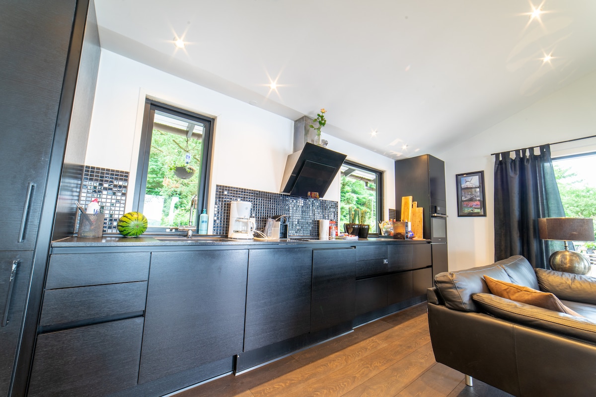 Cameră mare, recent amenajată, într-o clădire separată pe o proprietate agricolă. Intrare separată. Locuința este formată din living/bucătărie, dormitor și baie. În total 30 m2. Totul în materiale luminoase și prietenoase. Există frigider, cuptor / cuptor cu microunde și plită cu inducție. Locuința este dotată cu toate ustensilele de bucătărie necesare, pahare și tacâmuri. Există posibilitatea de a împrumuta Chromecast.