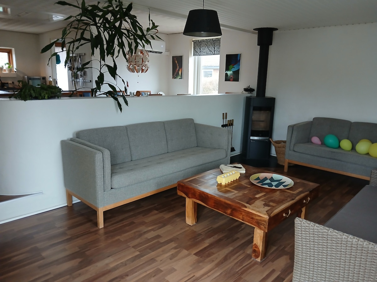 Casă minunată în mediul rural, unde ai mult spațiu în interior și în exterior. Casa este parțial nou construită în 2024/2025, iar restul este renovat, printre altele, cu o baie nouă, paturi și mobilier. Locuința conține hol de intrare, bucătărie/living mare, living, baie și 3 dormitoare, suprafața 131 m2. Distanța până la Legoland 12 km. Zonă minunată în aer liber, cu lac, vatră și grădină de mere. Lenjerie de pat, prosoape, cârpe de vase, prosoape de vase etc. incluse.