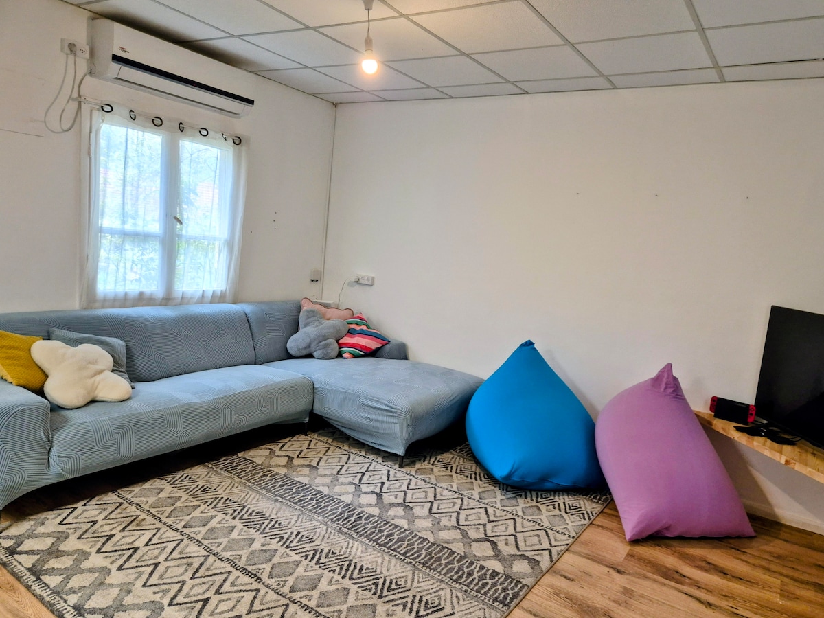 Un loc spațios potrivit pentru familii, cu mult spațiu pentru a petrece timp împreună. Casa are 2 dormitoare cu un pat dublu (dormitor matrimonial 190/160 * saltea cu pat mic * * camera de oaspeți 190/140) și un alt dormitor pentru copii cu un pat de o persoană și 2 saltele single. Există posibilitatea de a adăuga o singură saltea în dormitorul principal și un pătuț de camping. Casa are un spațiu central mare, cu o bucătărie confortabilă și complet utilată și o mulțime de zone de relaxare în jurul și în afara casei. Există o punte mare cu vedere la munți, cu o zonă de grătar, iarbă mare și o trambulină. Casa se află la câțiva pași de pârâul din interiorul kibbutzului, iar în sezon există opțiunea de a intra în piscina cu kibbutz contra cost la intrare.