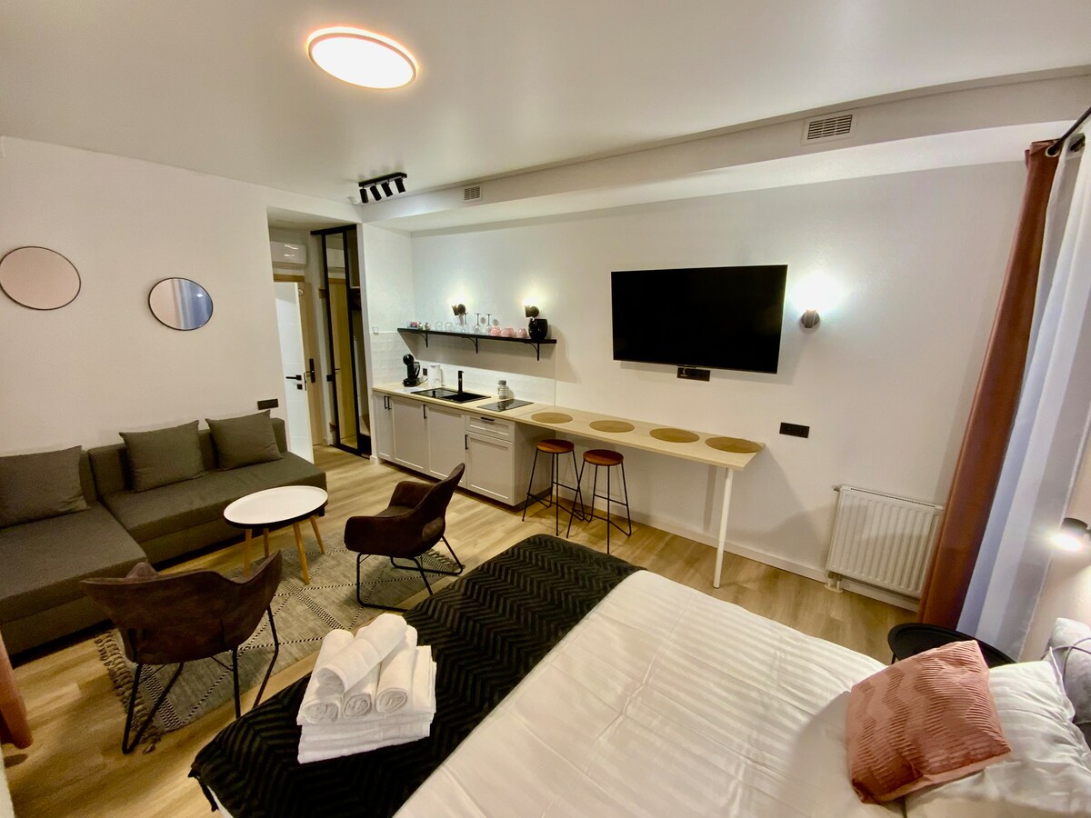 Studio proaspăt mobilat în centrul orașului Druskininkai – ideal pentru muncă, cupluri sau familii mici. Livingul luminos se transformă într-un spațiu de dormit confortabil, cu un spațiu de lucru dedicat. Bucură-te de două balcoane mobilate, aer condiționat, Wi-Fi rapid și o bucătărie complet utilată cu mașină de spălat vase. Mergi pe jos până la AQUA Park (900 m), iazul Vijūnėlės (800 m), iazul Druskonis (600 m) și Health Resort (650 m). Calm, elegant și perfect situat atât pentru odihnă, cât și pentru inspirație.