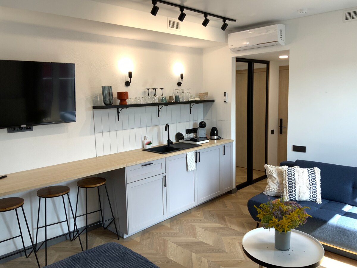 Freshly furnished studio in central Druskininkai – ideal for workations, couples, or small families. The bright living room transforms into a cozy sleeping space with a dedicated workspace. Enjoy two furnished balconies, A/C, fast Wi-Fi, and a fully equipped kitchen with dishwasher. Walk to AQUA Park (900 m), Vijūnėlės Pond (800 m), Druskonis Pond (600 m), and the Health Resort (650 m). Calm, stylish, and perfectly located for both rest and inspiration.